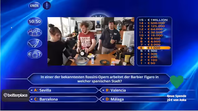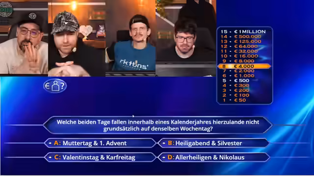 05:42:36Der Streamer nimmt an einem Quiz teil, bei dem er noch drei Joker zur Verfügung hat. Er muss die Frage nach der Frankfurter Tabelle beantworten und entscheidet sich für Reisepreisminderung, da er als Kaufmann für Tourismus und Freizeit arbeitet. Dies bringt ihm 25.000 Euro ein und steigert sein Gesamtkapital auf 125.000 Euro. Der Prozess des Quizspiels wird mit viel Enthusiasmus und strategischer Überlegung durchgeführt, wobei der Streamer jeden Joker bewusst einzusetzen scheint.