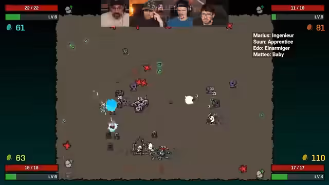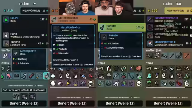18:00:36Die Streamer wechseln zu neuen Charakteren und versuchen, verschiedene Builds zu testen. Einer ist der 'Baumeister', der von Bäumen profitiert, während andere Charaktere wie 'Napoleon Bonaparte' oder 'Baby' getestet werden. Es kommt zu Schwierigkeiten, die richtigen Items und Upgrades zu finden, und die Streamer sterben mehrmals. Sie versuchen, ihre Builds anzupassen und ihre Stärken zu nutzen, um die Wellen zu überstehen.