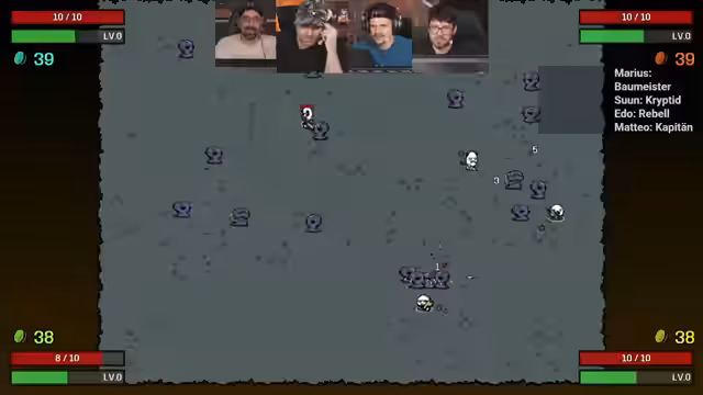 18:48:30Das Stream-Team kämpft durch verschiedene Wellen Gegnern in einem Spiel, das an ein Survival-Tower-Defense erinnert. Der Streamer beschäftigt sich mit verschiedenen Strategien zur Verbesserung der Rüstung und Lebensregeneration, um länger durchzuhalten. Die Kommunikation im Team ist manchmal unklar, was zu Verwirrung und manchmal zum Tod von Spielern führt, besonders wenn Entscheidungen über den Kauf von Items getroffen werden.