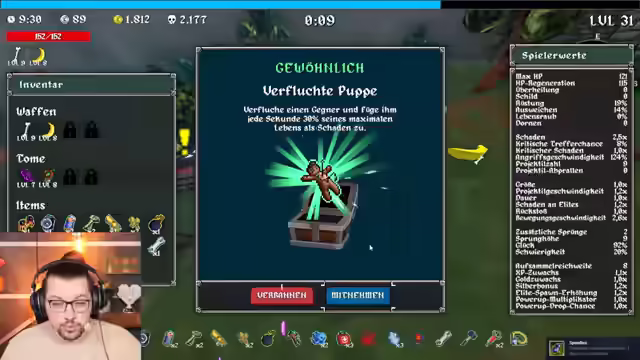 00:21:11Der Streamer demonstriert die Mobilität des Charakters und sammelt Schreine und Power-Ups, wobei er die Projektilanzahl erhöht und legendäre Power-Ups wie das Hunt Tool nutzt. Er nimmt jede Schwierigkeits-Taube mit, um mehr Gegner zu erzeugen und somit mehr Kills zu erzielen. Der Knochen wird mit Projektilanzahl und Abprallern verstärkt, um einen Cleaver-Effekt zu erzielen. Elite-Spawns werden erhöht, um mehr Chancen auf Kisten zu haben. Er ignoriert zunächst die meisten Gegner, um die Map nach Schreinen und Händlern abzusuchen, wobei er Rüstung, Gold und Glück priorisiert. Glück erhöht die Chance auf bessere Upgrades. Vasen werden für zusätzliches Geld und XP mitgenommen. Er wählt Glück und Projektilanzahl als Tomes und freut sich über die hohe Mobilität seines Charakters. Er erwägt den Einsatz von Flüchen gegen Bosse und priorisiert zusätzliche Sprünge, um mobil zu bleiben und Geistern auszuweichen.