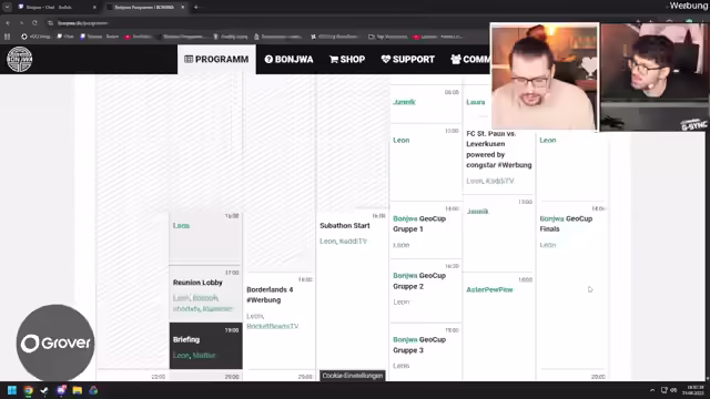 06:41:23Donnerstag ist der offizielle Start des Sabathons um 16 Uhr mit Kaddi und Mia. Es wird eine kleine Win-Challenge geben. Ab 20 Uhr kommen noch Milchbaum, Simon und Matteo dazu und es gibt eine zweite Ausgabe Bon Joa Domini. Am Abend kommt Soon vorbei und es wird durch die Nacht Dark & Darker gespielt. Ab 6 Uhr morgens übernimmt Yannick die Morgenschicht. Am Samstag startet um 14 Uhr das Geogässer-Turnier mit 16 Streamern. Es gibt vier Gruppen und die Top zwei jeder Gruppe qualifizieren sich fürs Finale am Sonntag. Der Streamer wird das ganze kommentieren. Am Freitag wird Andy die Nachtschicht übernehmen und Laura die zweite Frühschicht des Sabathons. Am Samstag wird es einen IRL-Stream vom Millenthor-Stadion geben, da St. Pauli und Kongster miteinander verpartnert sind. Astor wird am Samstag ab 18 Uhr aus dem Studio streamen. Am Sonntag übernimmt Andi wieder die Nachtschicht, Yannick die Frühschicht und der Streamer kommt um 12 Uhr. Gegen 14 Uhr geht das Borgia Geocup Event weiter und es gibt die Finals. Abends kommt Matteo wieder und es gibt Judgmental.