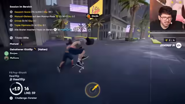 10:24:50Es wird über Schwierigkeiten und Erfolge beim Ausführen von Triple-Flips und Grinds im Spiel gesprochen. Es wird diskutiert, ob man denselben Grind mehrmals machen kann oder ob es verschiedene sein müssen. Die Manuals, insbesondere die Wheelies, stellen eine besondere Herausforderung dar, und es wird über die richtige Technik diskutiert, um diese auf den gelben Manipads auszuführen. Es wird festgestellt, dass es gar nicht so einfach ist und viel Übung erfordert. Nach anfänglichen Schwierigkeiten gelingt es schließlich, die Aufgabe zu lösen, was als Erfolg gefeiert wird. Die Spieler erkunden die Steuerung und versuchen, die Feinheiten der Bewegungen zu verstehen, um die Tricks erfolgreich auszuführen. Die Freude über den Erfolg ist groß, und es wird direkt zum nächsten Ziel übergegangen.