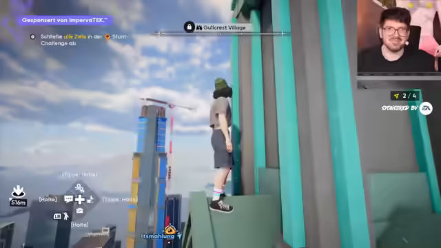 11:02:52Es wird über den Fortschritt beim Klettern auf das höchste Gebäude berichtet, wobei einer der Spieler bereits 100 Meter Höhe erreicht hat. Ein Marker wird gesetzt, um den erreichten Punkt zu markieren. Es wird festgestellt, dass das Klettern sehr befriedigend ist. Kurz vor dem Erreichen der grünen Spitze des Gebäudes werden weitere Objekte platziert, um den Aufstieg zu erleichtern. Ein Zuschauer namens Fischi wird für einen Raid gedankt. Es wird erklärt, dass die Objekte für alle anderen sichtbar bleiben, was jedoch nicht sicher ist. Die Bänke werden als die besten Kletterhilfen identifiziert. Nach weiteren Anstrengungen und dem Bau von Kletterhilfen wird schließlich die Spitze des Gebäudes erreicht. Es wird jedoch festgestellt, dass es noch ein höheres Gebäude gibt, was aber ignoriert wird. Nach dem Erreichen der Spitze wird EA für die Möglichkeit zum Klettern und Skaten gedankt. Abschließend springen die Spieler vom Gebäude und landen auf unterschiedlichen Dächern.