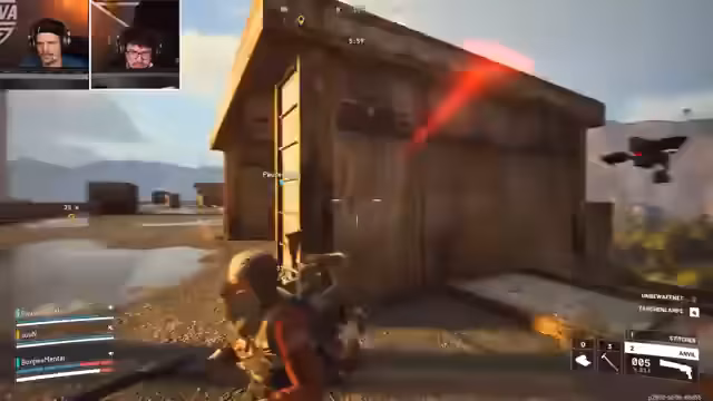 01:07:07Das Ziel verlagert sich auf das Finden des neuen Bosses 'Matriarch' auf der Spaceport-Map. Der Boss beschreibt man als sehr schnell, aggressiv und mit einem Schild sowie kleinen Drohnen bewaffnet, was ihn zur Herausforderung macht. Nachdem das Team sie entdeckt hat, startet ein heftiger Kampf, in dem ein rivalisierendes Team den Boss ebenfalls angreift. Die Streamer schlagen vor, die ausgeraubten Gegner anzugreifen, während der Boss beschäftigt ist, aber ihre Position ist gefährlich exponiert.
