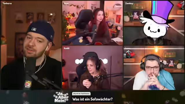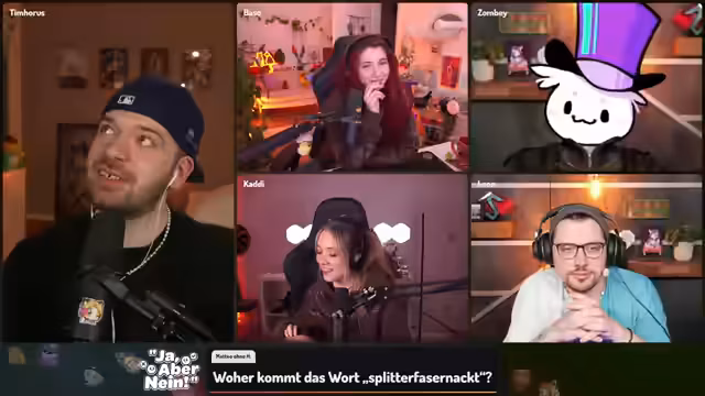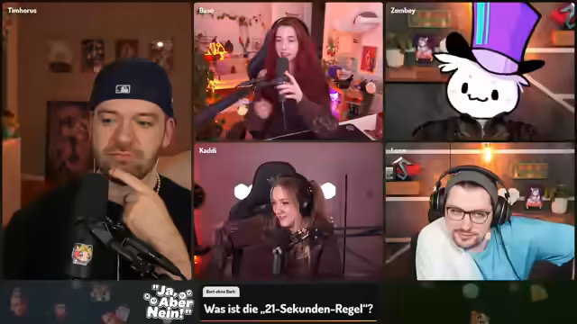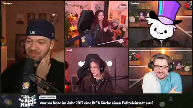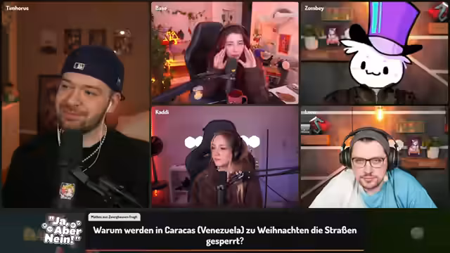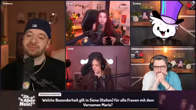 02:52:57Das neue Format, das Tim als „Ja, aber Nein“ vorstellt, ist eine Adaption der TV-Show „Genial daneben“. Die Gäste, Linda (aka Basso), Zombay, Leon und Kaddi, müssen skurrile Fragen gemeinsam beantworten. Die erste Frage, gestellt von Matteo aus Zwerghausen, lautet: „Warum werden in Caracas, Venezuela, zu Weihnachten die Straßen gesperrt?“ Die Gruppe spekuliert über Aberglauben, rutschige Straßen in den Bergen oder das Verhindern von Unfällen, um das „Fest der Liebe“ zu schützen. Tim gibt Hinweise, dass es etwas mit „nicht mit Autos fahren“ und „kulturell/historisch“ zu tun hat. Die Diskussion entwickelt sich in Richtung einer kollektiven Versammlung zu Fuß und der Idee, dass die Straßen für eine Art Fest oder Gottesdienst genutzt werden. Die Gäste sind nah dran, vermuten jedoch fälschlicherweise, dass die Straßen vereist werden, um Schlittschuh zu laufen. Die Auflösung enthüllt, dass die Bürger von Caracas an Weihnachten mit Rollschuhen zum Gottesdienst fahren und die Straßen aus Sicherheitsgründen gesperrt werden, um dies zu ermöglichen.