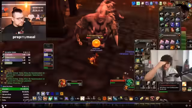 00:46:31Ein Fokus liegt auf dem 'Rammstein'-Event im Dungeon Strat UD. Der Streamer führt aus, dass der Dungeon-Leader Julie aufgrund seines Kamerawinkels den Pull eines weiteren Gegners nicht sah. Dies führte zu einer unkontrollierbaren Situation, in der zu viele Gegner auf einmal bekämpft werden mussten. Julie opferte sich schließlich selbst, um seine Mitspieler zu retten, indem er seine 'Bubble' nutzte, um Aggro zu verlieren, und sich dann sofort heilte, um sie zurückzugewinnen.