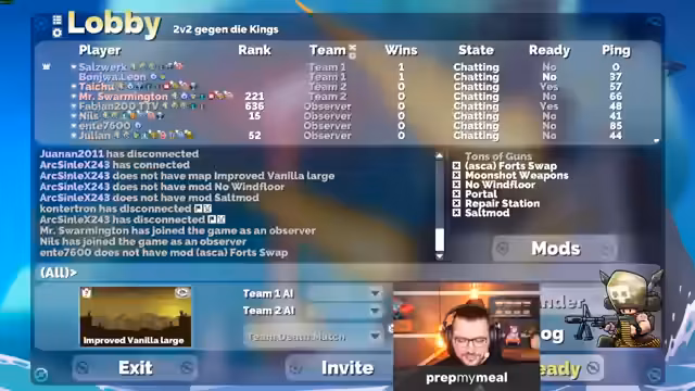 02:25:33Ein langanhaltender Teil des Streams besteht aus einer 2v2-Vanilla-Fort-Partie gegen Taichu. Es werden verschiedene Strategien, wie z.B. den Gegner zu swapen, Laser zu bauen und mit Swarms zu attackieren, besprochen und umgesetzt. Nach einem knappen Sieg gegen Taichu spielen sie noch weitere Maps, darunter Corporate Elimination und eine custom Map aus einem Turnier.
