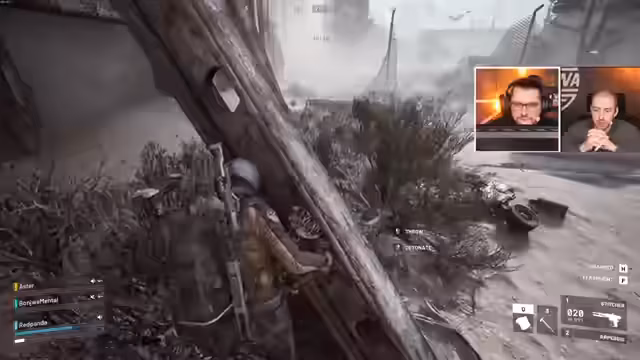 01:20:15Der Stream startet mitten in einem intensiven Feuergefecht in einem Spiel, das wie Ark Raiders aussieht. Das Team befindet sich in einem riskanten Rückzug, da die Munition zur Neige geht. Ein Gegner wird direkt hinter einem Truck gesichtet, was zu einem hektischen Ausweichmanöver führt. Der Fokus liegt auf taktischer Deckung, Markieren des Feindes und dem koordinierten Versuch, den Gegner auszuschalten, während gleichzeitig auf die eigenen Teammitglieder geachtet wird.