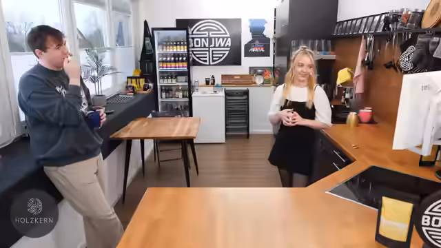 00:19:13Während auf Vera gewartet wird, führt Yannick eine spontane Tour durch das Studio. Er beschreibt den chaotischen und sehr persönlichen Zustand der Küchen- und Arbeitsbereiche, der spontan an WG-Verhältnisse erinnert. Laura ist ebenfalls anwesend und beide bereiten etwas für einen Stream am kommenden Montag vor, was eine unordentliche Vorbereitung zur Folge hat.