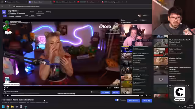 07:12:58Ein fiktives Date-Szenario wird ausgespielt, bei dem der Streamer eine Figur namens Lilly trifft. Es kommt zu humorvollen und absurden Interaktionen, unter anderem durch die prompte Tötung einer Katze, was zu Diskussionen über Streamer und ihr Verhältnis zu Tieren führt. Das Date verläuft holprig, geprägt von Chaos, Wortspielen und einem mangelnden Sinn für die Figur der Lilly.