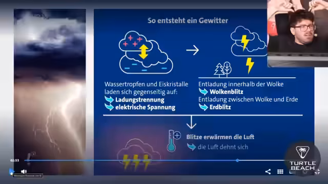 01:13:39Ausgehend von einem Video über einen Blitzschlag in ein Auto beginnt eine lange und hitzige Diskussion über die Entstehung von Blitzen. Der Streamer versucht zunächst selbst zu erklären, wie Blitze entstehen und warum sie Autos treffen können. Seine Erklärungen werden von Chatmitgliedern korrigiert und ergänzt. Gemeinsam wird das Prinzip der Influenz erörtert, bei dem die negative Ladung der Wolke den Boden positiv auflädt und so die Spannung erhöht. Schließlich wird eine Zusammenfassung gegeben: Gewitterwolken laden sich durch Reibung auf, es entsteht eine Spannung, die sich bei zu großer Ladung entlädt und als Blitz sichtbar wird, während der Donner durch die heiße Luft entsteht.