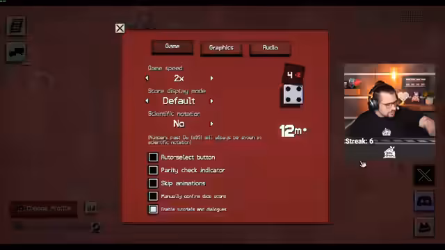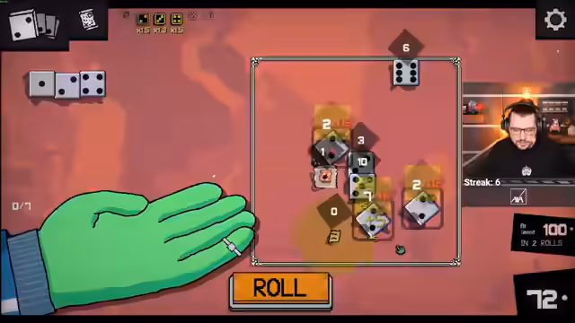 01:18:47Als nächstes wird zu 'Dice a Million', einem sehr schwierigen Würfelspiel-Roguelike, gewechselt. Der Streamer gibt zu, das Spiel in der Vergangenheit oft gespielt, aber noch nie einen kompletten Run geschafft zu haben. Er nutzt einen Beta-Branch, der eine 'Boss Reroll'-Funktion enthält, um das Frusterlebnis zu mildern. Der Start erfolgt mit einer vielversprechenden Hand, die ihm ermöglicht, in der ersten Runde viele Würfel auf einmal zu werfen. Der Fokus liegt darin, durch Upgrades und spezielle Ringe einen Multiplier auf alle Würfel zu erzeugen, um die geforderte Quote zu erfüllen.