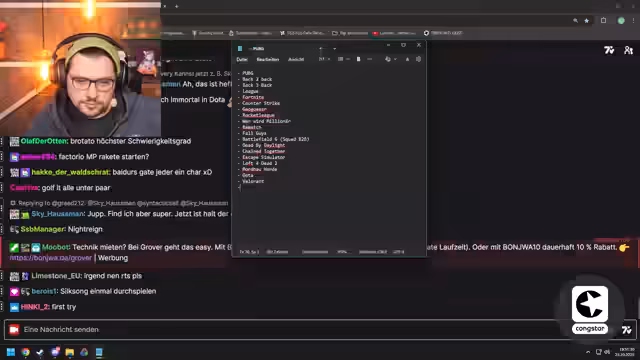 06:12:46Nachdem die Planung für den Stream abgeschlossen ist, übergibt der Streamer an 'Matteo', der bereits seit Stunden live ist. Matteo berichtet, dass er durch 'Dark and Darker' völlig erschöpft ist, da er nicht nur lange gestreamt, sondern auch zu Hause weitergespielt hat, um Sets für das Spiel zu bauen, die dann in der Nacht verloren gehen. Er vergleicht es mit 'EFT', jedoch 'schlimmer', da alles verloren geht. Trotzdem macht ihm das Spiel 'mega Bock' und sei 'wieder richtig nice' geworden, mit vielen Balance-Änderungen, neuen Items und einem verbesserten Loop, insbesondere durch die 'Squire to Rich'-Playlist, bei der alle mit nichts starten und sich hocharbeiten. Matteo plant, heute Abend 'Mars First Logistics' oder 'Q Remastered' zu spielen, wobei er 'Mars First Logistics' favorisiert, da es neu ist. Er erwähnt auch, dass 'Asta' morgen um 16 Uhr live sein wird und er selbst ins Kino gehen wird, um einen Horrorfilm zu sehen.