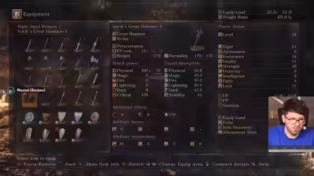 00:00:32Der Streamer beschäftigt sich ausführlich mit den verschiedenen Upgrade-Optionen für seine Waffe. Er erklärt den Unterschied zwischen Raw-, Heavy- und anderen Edelsteinen und wie diese je nach Spielstil und Charakterentwicklung vorteilhaft sein können. Er sammelt Ressourcen wie Titanite Shard und berät sich mit dem Chat über die optimale Strategie für die Verbesserung seiner Axt, die er zum Hauptangriffsinstrument wählt.