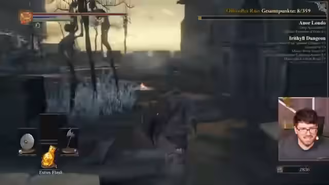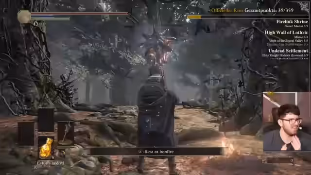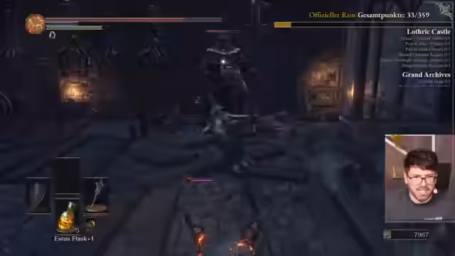 07:46:17Nach einer langen Spielsektion in Dark Souls 3 erleidet der Streamer eine frustrierende Niederlage. Er kämpft gegen einen Boss, dessen Angriffe ihm unerwartet extrem viel Schaden zufügen. Ein spezieller Counter-Angriff mit Heavy-Attack reduziert seine Lebenspunkte drastisch und führt zum Tod, was ihn sehr überrascht und verärgert. Er analysiert die Situation und stellt fest, dass er den Schaden nicht kommen sah, was das Resultat von 39 Punkten für das Event ist, eine Leistung, die er als enttäuschend ansieht.
