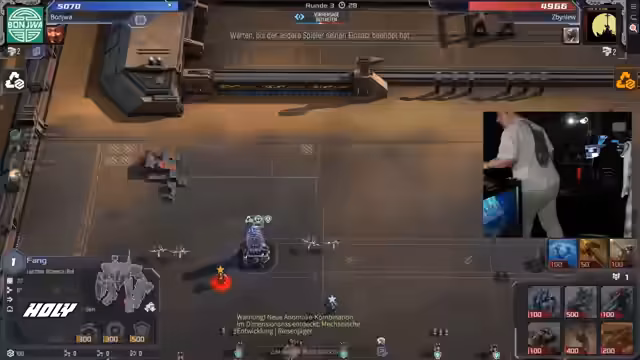02:50:28Es beginnt ein intensives 1- und 2-gegen-2-Duell in MechaBellum zwischen Leon und Maxim. Die beiden kommentieren ihre Züge und Strategien intensiv, wobei Leon sich schwach fühlt, während Maxim aggressiv spielt. Es kommt zu verbalen Auseinandersetzungen und gegenseitigen Provokationen.