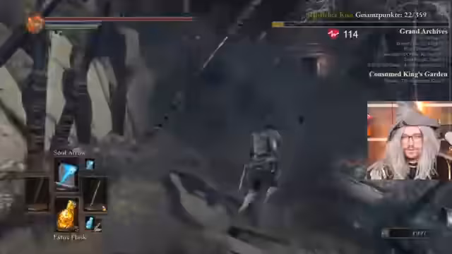 03:10:50Der Streamer hat Respekt vor seinen Konkurrenten, besonders vor Lord Pappnase, der ihn punktemäßig dicht folgt. Nachdem er im Sumpf einige Gegner besiegt hat, geht er zu seinem Magielehrer Orbeck, um neue Zauber zu erlernen. Er kauft Great Soul Arrow und Heavy Great Soul Arrow, die in den meisten Runs nützlich sind. Im Faron Keep aktiviert er drei Fackeln, um Zugang zu den Abyss-Watchern zu erhalten. Er diskutiert mit Chat über die Taktik gegen einen besonders schwierigen Gegner, der Selbstbünde verwendet und dadurch mehr Schaden verursacht.