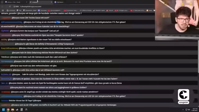 01:30:22Die Streamer kündigen ihre Teilnahme an der Polaris am 11. Oktober an, wo sie mit Control Dominate live auf der Bühne stehen werden. Für die Gamescom wird das Programm angesprochen, wobei fixe Termine für Mittwoch und Donnerstag angekündigt werden. Ein fester Zeitplan ist jedoch noch nicht möglich, da alles spontan und flexibel gestaltet werden soll. Dies soll über den News-Kanal in Discord oder WhatsApp kommuniziert werden, um flexibel auf die Besucher reagieren zu können.