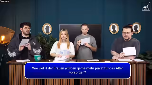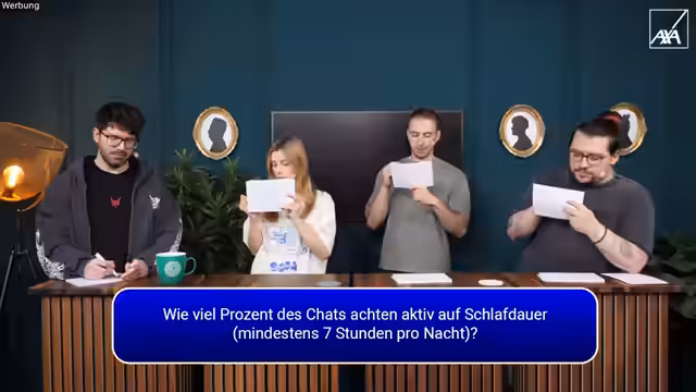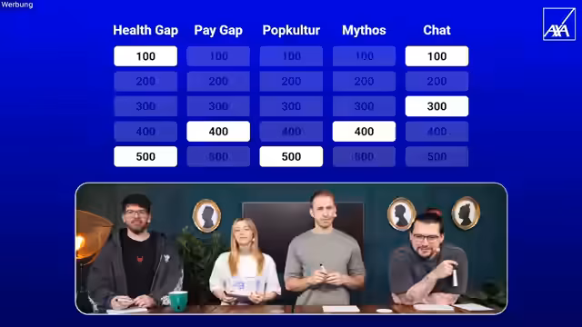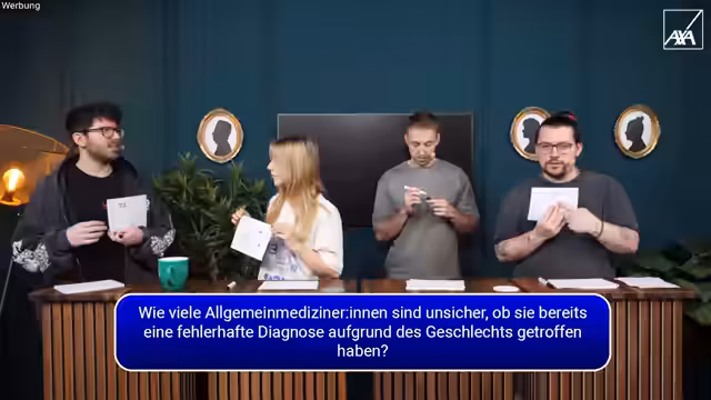 04:12:18Nach einer kurzen Diskussion über die Pünktlichkeit und Morgenroutinen der Anwesenden, kündigt der Moderator den Beginn des Live-Streams an. Es wird ein Quiz in Zusammenarbeit mit AXA veranstaltet, bei dem es eine Nintendo Switch zu gewinnen gibt. Das Quiz konzentriert sich auf den Gender-Health-Gap, ein Thema, das die ungleichen Gesundheitsbedingungen und die Gesundheitsversorgung von Männern und Frauen beleuchtet. Ziel ist es, auf die Probleme aufmerksam zu machen, die entstehen, wenn Geschlechterunterschiede in der medizinischen Behandlung nicht ausreichend berücksichtigt werden. Die Teilnehmer müssen ihre Antworten auf Zetteln notieren, und es gibt verschiedene Kategorien wie Health Gap, Pay Gap, Popkultur und Mythen. Auch der Chat wird in einige Fragen einbezogen, bei denen die Teilnehmer einschätzen müssen, wie die Community abstimmt.
