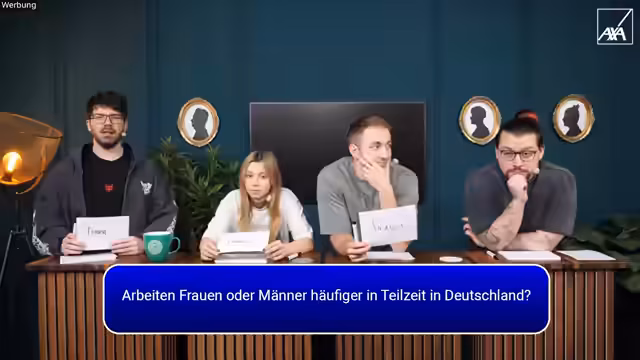 04:34:39Die Frage „Popkultur 200“ wird gestellt: „Wie hoch ist der Anteil weiblicher Spielercharaktere in World of Warcraft 2008?“. Die Teilnehmer schätzen die Prozentzahl, wobei die richtige Antwort 42 Prozent ist. Es wird diskutiert, warum Spieler weibliche Charaktere wählen, und es wird ein Funfact erwähnt, dass die Attraktivität der Charaktere eine Rolle spielt. Danach folgt „Paygap 300“: „Arbeiten Frauen oder Männer häufiger in Teilzeit in Deutschland?“. Alle Teilnehmer antworten korrekt mit „Frauen“, basierend auf dem klassischen Rollenbild und der Tatsache, dass 47 Prozent der Frauen und nur 10 Prozent der Männer in Teilzeit arbeiten.