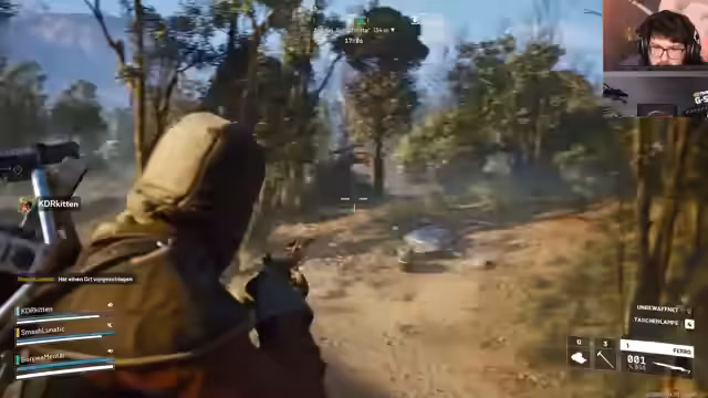 01:15:32Die Spieler beklagen die schlechten Sicht- und Hörbedingungen bei Regen, was die Navigation und das Erkennen von Gegnern erschwert. Sie vergleichen ihre Situation humorvoll mit Formel-1-Fahrern im Regen. Es wird über das Alter der Spieler und die Kommunikation mit jüngeren Mitspielern im Voice-Chat gesprochen, wobei ein Spieler seine Scheu äußert, sein Alter preiszugeben. Die Frage, ob man zuerst looten oder direkt zum Checkpoint gehen soll, wird diskutiert, und man entscheidet sich für den direkten Weg zum Checkpoint. Eine Diskussion über die Menschlichkeit im Spiel und den Umgang mit anderen Spielern zeigt, dass die eigene Gruppe als Einheit betrachtet wird, während andere Spieler als potenzielle Gegner gesehen werden.