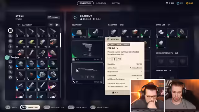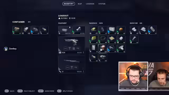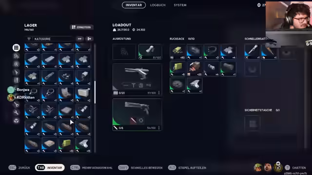 02:39:02Nach einem erfolgreichen Raid, bei dem die Spieler wertvolle Blueprints und eine Venator 2 erbeuten, wird das Lager aufgeräumt und organisiert. Ein Spieler plant, sein Lager weiter aufzurüsten und freut sich über den finanziellen Gewinn. Es wird über die Bedeutung von bestimmten Gegenständen wie dem 'Very Comfortable Pillow' für Quests diskutiert. Die Möglichkeit, den Rucksackinhalt mit einem Klick zu entleeren, wird entdeckt und genutzt, um das Inventar zu optimieren. Der Wert eines Karabinerhakens von 14.000 wird hervorgehoben, und der Defibrillator wird als überflüssig betrachtet, da Teammitglieder auch ohne ihn schnell wiederbelebt werden können. Die Spieler bereiten sich auf die nächste Runde vor, indem sie ihre Ausrüstung reparieren und Munition auffüllen.