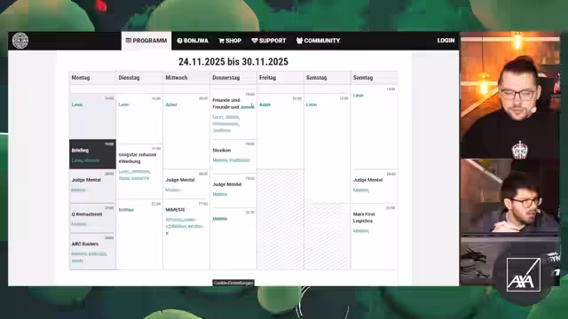 03:36:32Der Mittwoch bringt Aster zurück, der ab 16 Uhr solo streamt, gefolgt von 'Judgmental' und 'Mimesis' mit Smash Lunatic, KDR Kitten, dem Streamer und Soon. 'Mimesis' wird als kooperatives Vier-Spieler-Spiel beschrieben, ähnlich wie 'Lethal Company', bei dem man Gegenstände sammelt, um eine Quote zu erfüllen. Am Donnerstag ist der Streamer wieder dabei und hat Besuch: Zusammen mit 'Primera Vera' wird etwas ausgepackt, wobei die Spannung um den 1. Dezember aufrechterhalten wird. Am selben Tag ist der Streamer um 19 Uhr bei 'Pilsmeets' in der Lobby eingeladen, um 'Sloxikon' zu spielen, ein Ratespiel, bei dem man plausible Antworten auf obskure Fragen finden muss. Es wird spekuliert, ob Horst Lichter, der ehemalige Koch und Bodybuilder, dabei sein könnte. Danach gibt es wieder 'Dutch Mantle'. Freitag ist 'Astatag' ab 16 Uhr mit offenem Programm, und Samstag ist ein offener Stream-Tag für 'Schabernack'. Sonntag ab 14 Uhr gibt es 'Arnens Matteo' und die 'Mars-Mission', wobei der Mars besiedelt wird. Es wird betont, dass es diese Woche jeden Tag 'Bonjwa' gibt, was selten vorkommt.