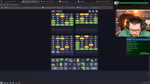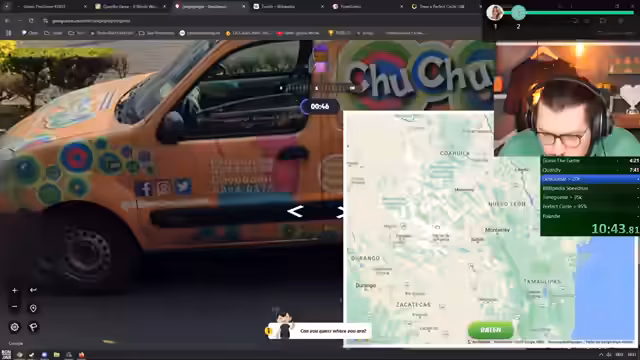 06:11:42Der Wettkampf gewinnt an Fahrt, und alle Teilnehmer sind voller Konzentration bei der Sache. Der Streamer kämpft bei Guess the Game mit einem Spiel, das er nie zuvor gesehen hat, und muss über 1000 Versuche durchgehen. Gleichzeitig versucht er bei Quirtly ein Wort zu erraten und bei Geoguessr einen mexikanischen Ort zu identifizieren, wobei er Zeitdruck hat und die Uhr tickt. Die technische Einrichtung mit Live-Split und den Spiel-Links scheint nun zu funktionieren, um den Überblick über den Fortschritt zu behalten.