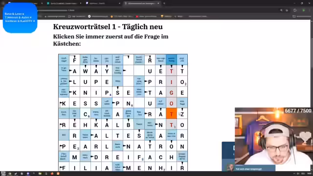 03:18:15Die Teilnehmer arbeiten intensiv an einem Kreuzworträtsel, bei dem es um Begriffe aus verschiedenen Bereichen geht. Es gibt Kontroversen bei der Lösung von Wörtern wie 'Dreifach', das als 'mehrfach' interpretiert wird, und 'Aufrührer', der vermutlich 'Anarchist' ist. Bei der Lösung 'Bigot' gibt es Unklarheiten. Das Team Kaddi und Jensen zeigt eine starke Leistung und löst fast alle Aufgaben. Andere Begriffe wie 'Pneu' für Luftreifen und 'Filia' für Tochter werden ebenfalls diskutiert.