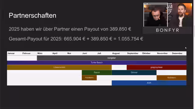 02:20:49Für das Jahr 2025 wurden insgesamt 98 Placements mit einem Gesamtpayout von 665.904 Euro verbucht. Diese umfassen nicht nur Live-Streams auf Twitch, sondern auch Short-Content für andere Plattformen wie TikTok oder Instagram. Zusätzlich wurden langfristige Partnerschaften mit einem Nettoumsatz von 389.850 Euro abgeschlossen. Die Kombination beider Geschäftsfelder macht die Haupteinnahmequelle aus. In den ersten Monaten des Jahres gab es jedoch einen Rückgang bei den One-Shot-Placements, was dazu führte, dass die Suche nach neuen langfristigen Partnern verstärkt wurde.