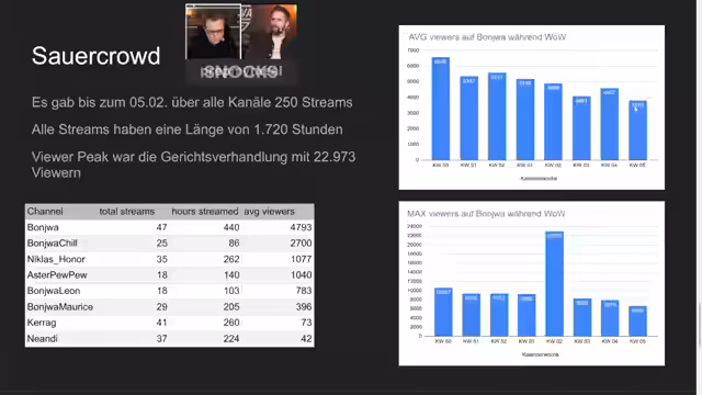 02:42:24Ein zentraler Teil des Streams widmet sich dem großen World of Warcraft-Event 'Sauerkraut'. Über alle Kanäle hinweg wurden 250 Streams mit einer Gesamtspielzeit von 1720 Stunden absolviert. Der Höhepunkt war die Gerichtsverhandlung mit einem Zuschauerschnitt von 22.973. Nach dem Hype zeigt sich ein natürlicher Abfall im Interesse, was als normal angesehen wird. Die Zahlen betonen jedoch den Erfolg des Events und den enormen Einfluss, den ein solches Thema auf die Reichweite haben kann.