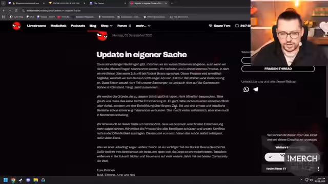 02:09:50Der Streamer berichtete über aktuelle Nachrichten aus der Szene. Es wurde das offizielle Statement von Rocket Beans angesprochen, in dem die Trennung von Simon Hill bestätigt wird. Der Streamer analysierte diese Entwicklung, die seiner Ansicht nach keine plötzliche, sondern eine über längere Zeit gewachsene Entscheidung ist, und äußerte seine Trauer über das Ende des Kern-Konstrukts, da er mit dem Aufgewachsen ist.