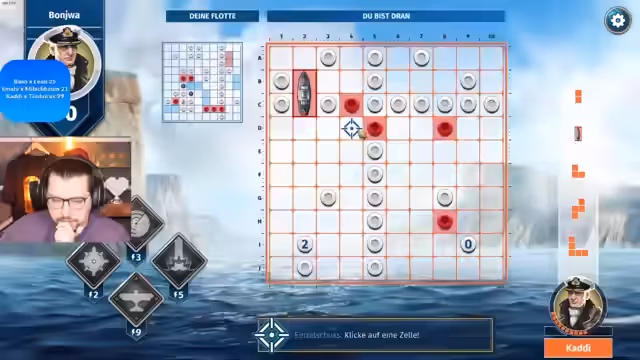 02:13:57Es wird eine Anekdote über einen vergessenen Badestöpsel erzählt. Die Schiffe werden platziert, wobei Sonja auf zufällige Platzierung setzt und ihre psychologischen Kenntnisse einsetzen will. Das Spiel beginnt mit einem Münzwurf, um zu entscheiden, wer anfängt. Die Fähigkeiten im Spiel werden während des Spielens erklärt. Es wird über die Platzierung von Minen und deren Auswirkungen diskutiert. Der Radarscan wird eingesetzt, um Schiffe in der Nähe zu entdecken. Es wird überlegt, ob man Schiffe sofort versenken oder lieber erst alle Schiffe finden soll, um mehr Mana zu sammeln. Die verschiedenen Fähigkeiten wie der 2x2 Artilleriebomb-Angriff werden vorgestellt.