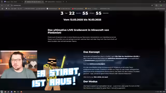 03:23:23Ein bemerkenswerter Wechsel im Stream findet statt, als der Streamer nach einem FragPunk-Duell zu Minecraft wechselt. Hier kündigt er offiziell die Staffel 2 der "Liga der Sterblichen" an, ein spezielles No-Dev-Format in Duo-Konstellation. Das Event startet am Mittwoch um 15 Uhr und endet am Sonntag. Das Ziel ist es, innerhalb von 12 Stunden Spielzeit pro Spieler so viele in-game Achievements wie möglich zu sammeln, wobei jeder Partner für seine eigenen Punkte verantwortlich ist, auch wenn der andere stirbt.