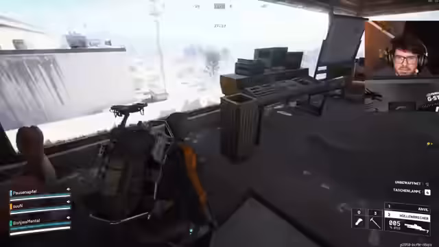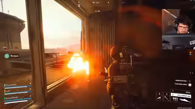 05:21:53Die Spieler begeben sich auf die Spaceport-Map für einen weiteren Raid und entscheiden sich, zunächst den Turm zu sichern. Sie entdecken andere Teams, die ebenfalls auf der Map unterwegs sind, und es kommt zu einer Konfrontation. Ein 'Observer' wird gesichtet, und die Gruppe überlegt, diesen anzugreifen, wird aber von gegnerischen Spielern gestört. Es kommt zu einem intensiven Feuergefecht, bei dem die Spieler versuchen, ihre Gegner auszuschalten und gleichzeitig Deckung zu finden. Trotz des Einsatzes von Smokes und Minen gerät die Gruppe unter Druck, und ein Spieler wird gedownt. Die Situation eskaliert, als weitere Gegner auftauchen und die Spieler in einem Bunker in die Enge getrieben werden. Es kommt zu einem chaotischen Kampf, bei dem die Spieler versuchen, sich zu heilen und ihre Gegner zu überwältigen.