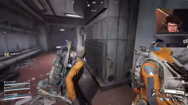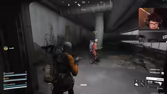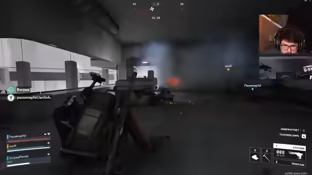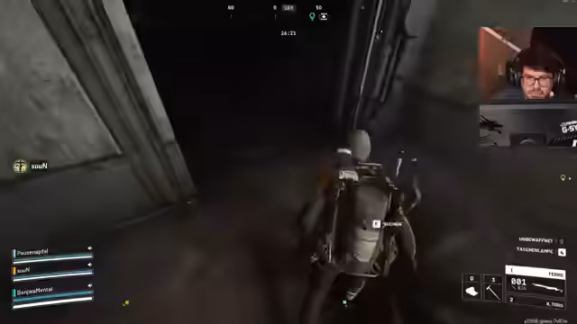 06:03:24Die Spieler entdecken Gegner in einem langen Gang und planen eine Strategie, um sie zu besiegen. Es handelt sich um drei Gegner, die die Gruppe näherkommen lässt, um sie effektiver angreifen zu können. Es kommt zu einem intensiven Feuergefecht, bei dem die Spieler erfolgreich einen Gegner nach dem anderen ausschalten. Die Taktik, die Gegner in den Gang laufen zu lassen, um sie ohne Deckung anzugreifen, erweist sich als erfolgreich. Nach dem Kampf sind die Spieler überladen mit Loot und beschließen, zum Extraktionspunkt zu gehen. Auf dem Weg dorthin werden sie jedoch von weiteren Gegnern beschossen. Ein Spieler wird getroffen und geht zu Boden, während die anderen versuchen, ihn zu decken und die Flucht zu ermöglichen. Die Situation wird sehr brenzlig, da der verbleibende Spieler unter Beschuss steht und versucht, einen sicheren Weg zum Exit zu finden.