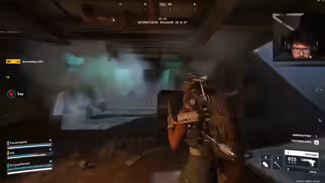 00:12:00Lynn und Kay stoßen zum Stream hinzu, was die Möglichkeit für gemeinsame Spiele eröffnet. Es wird über die Wahl des Loadouts und der Karte diskutiert, wobei Stella Montes als Option genannt wird. Ein Spieler äußert den Wunsch, Punkte für bodenbasierte Arc-Gegner zu sammeln, um einen Uprank zu erreichen. Die Matriarchen-Mission wird als ineffizient für dieses Ziel eingestuft, da sie wenig Schaden nimmt. Das Team einigt sich darauf, gemeinsam Arc Raiders zu spielen, ohne eine spezifische Präferenz für eine Mission, da der Spaß am Spiel im Vordergrund steht. Es wird auch über einen beeindruckenden Clip gesprochen, in dem ein Spieler auf Stella Montes viele Gegner ausschaltete und die Reaktionen der besiegten Spieler thematisiert wurden.