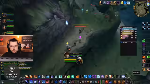 07:49:58Das Team bewegt sich durch die Kathedrale, ein Dungeon, mit dem der Streamer als kontrollierender 'Wasserspinner' Mage vertraut ist. Die Vorfreude auf den kommenden Doppelboss-Endkampf ist spürbar. Das Gameplay erfordert präzises Timing und Rücksichtnahme auf die Cooldowns der Mitspieler, um den Schaden der Gegner zu managen und effektiv agieren zu können.