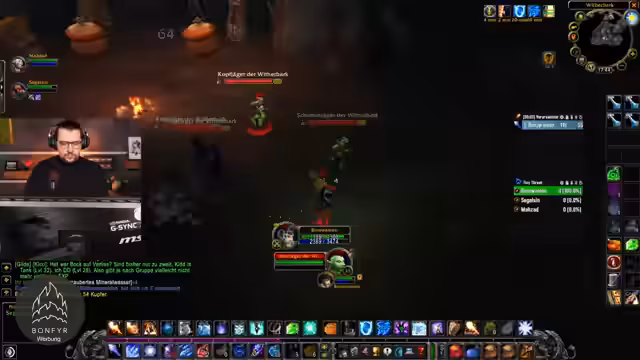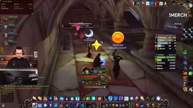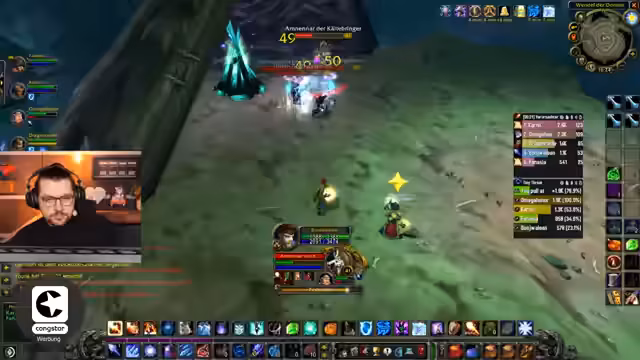 04:30:27Der Streamer nutzt viel Mana, um gegnerische Flüche zu entfernen, und bemerkt, dass sein Mana-Pool im Vergleich zu anderen Spielern größer ist. Es laufen Absprachen über die Positionierung im Dungeon; tendenziell wird rechts gehalten, um Chain-Pulls von oben zu vermeiden. Die Gruppe muss Skelett-Beschwörer und Geister kontrollieren, wobei Letzere 'Frostnova' wirken können. Der Streamer gibt klare Anweisungen, wer 'Gegenzauber' auf welche Mobs ansetzen soll, um die Kontrolle über den Kampf zu behalten.