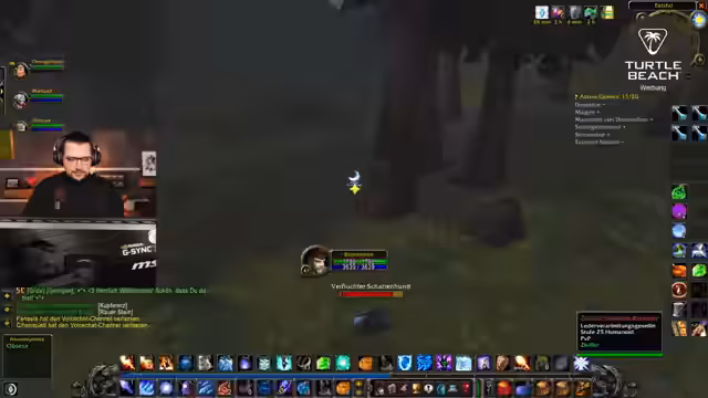 04:19:41Der Streamer startet die Quest 'Das Schattenlabyrint', die ein kleines Event mit Wellen von Gegnern auslöst, die automatisch spawnen. Er warnt die Gruppe, besonders Anni, darauf zu achten, wo der patrouillierende Boss 'Diener der Flammen' gerade ist, um eine unerwünschte Aggro zu vermeiden. Als der Boss erscheint, geht der Streamer in Rage-Form, baut Wut auf und stellt sicher, dass Niklas nicht sofort voll angreift, da dies den Tank in eine gefährliche Position bringen würde.