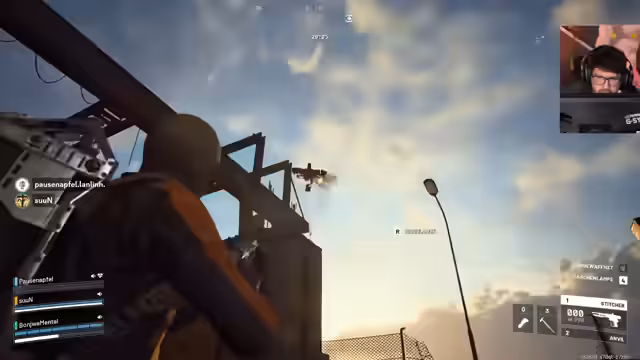 03:51:00Die Spieler geraten in einen weiteren Kampf, bei dem ein Gegner durch einen Headshot ausgeschaltet wird. Kurz darauf werden sie von weiteren Gegnern unter Beschuss genommen, die sich unter einem blauen Dach verstecken. Es entwickelt sich ein hitziger Austausch mit Granaten und gezielten Schüssen. Ein Spieler wird getroffen und geht zu Boden, während die anderen versuchen, die Stellung zu halten und den Gegner zu bekämpfen. Die Gegner versuchen, in einen Lift zu fliehen, aber die Spieler verfolgen sie über Dächer und Mauern. Trotz des Adrenalins und der intensiven Schießerei schaffen es die Gegner, zu entkommen. Die Spieler sind erleichtert, dass sie mit einem blauen Auge davongekommen sind und loben den spannenden Kampf über die Dächer.