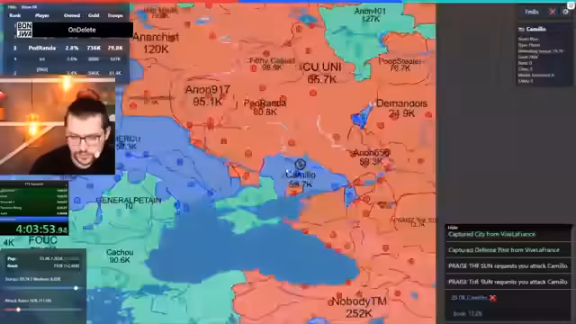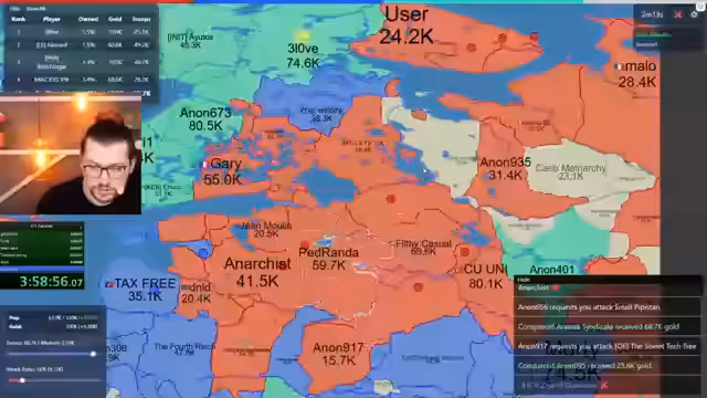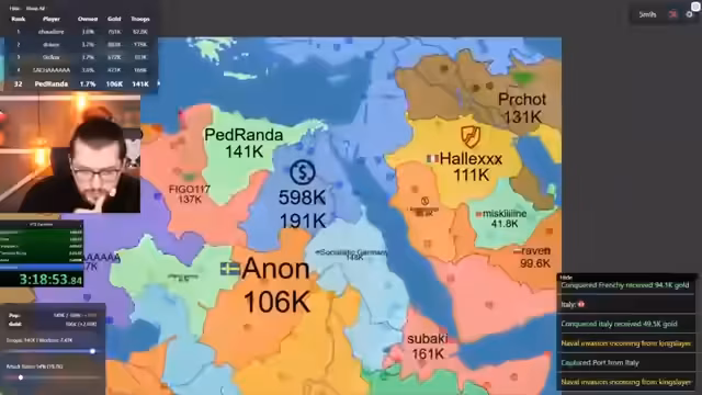 06:08:32Nach einer Phase des Rückzugs und des Wiederaufbaus, in der er viele Städte verloren hat, unternimmt der Streamer einen Gegenangriff. Er verlagert seine Truppen und nutzt die Gelegenheit, wenn ein anderer Spieler einen gemeinsamen Feind angreift. Das Ziel ist, verlorene Gebiete zurückzuerobern und seine Position als eine der stärksten Nationen auf der Karte wiederzuerlangen, indem er geschickt die Schwäche anderer ausnutzt.