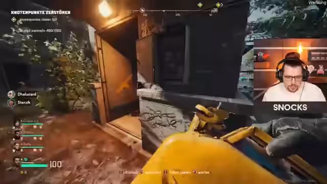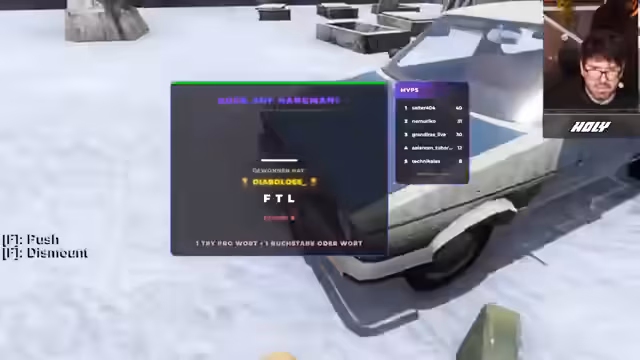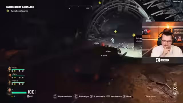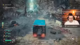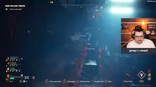01:03:41Der Stream wechselt zu einem neuen Spiel, dem kooperativem Horrorshooters John Carpenter's Toxic Commando. Zusammen mit den Streamern Dalu und Sterzmann startet er das Tutorial. Die Gruppe erkundet gemeinsam die Spielwelt, sammelt Ressourcen wie Munition und Ersatzteile und bekämpft Horden von Zombies. Es werden die Grundlagen der Kooperation gezeigt, wie das Bedienen eines Fahrzeugs mit mehreren Rollen (Fahrer, Schütze, Beifahrer) und die Reparatur von Objekten.