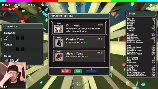 00:00:00Der Streamer startet einen Run und begutachtet die Upgrades. Er entscheidet sich für Size anstelle von Jump Height und wählt Epic-Upgrades, was ihn als "komplett broke" bezeichnet und den Run als potenziellen Rekordlauf einstuft. Er diskutiert verschiedene Upgrade-Optionen wie Sword, Pickup-Range und Crit-Chance, wobei er Pickup-Range priorisiert, um schneller zu leveln. Aura wird verworfen, und er überlegt Movement Speed, entscheidet sich aber dagegen. Es folgt eine Diskussion über Crit-Chance und frühere Builds mit Count und Attack Speed. Erwägt Lifesteal, verwirft es aber als "Scam" und bannt stattdessen Chunkers. Er wählt HP Regeneration gegenüber Damage, um das Überleben zu sichern. Der erste Bosskampf steht bevor, und der Streamer äußert Bedauern über verpasste Chancen und Schwierigkeiten mit der Echse.