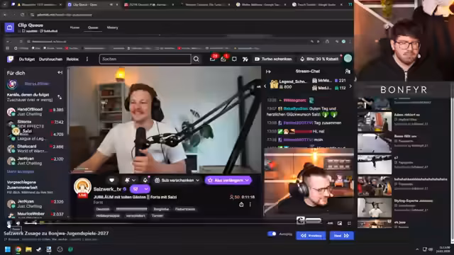 00:15:41Der Stream beginnt mit Erinnerungen an vergangene Events. So berichtet der Streamer von einem besoffenen Abend auf der Gamescom, wo er und seine Freunde Wettrennen mit Stühlen machten. Dabei erwähnt er eine Aufnahme, die möglicherweise an seine Mutter geschickt wurde. Des Weiteren spricht er über geplante Aktivitäten mit Leon und Janik, wie zum Beispiel ein Video, in dem er mit einem Stuhl durch die Gegend fährt, und die gemeinsame Teilnahme an einem sogenannten Offstream, für den sie ein Placement hatten.
