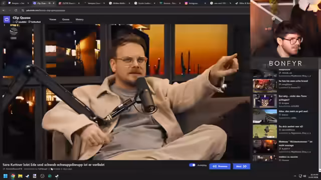 05:54:56Plötzlich kündigt der Streamer den nächsten Merch-Drop von 'bonjwa' an und erwähnt ein selbstausgewähltes, bevorzugtes Oberteil. Er entwickelt den lustigen Designer-Namen 'Marcelo Maserati' und teilt eine persönliche Anekdote von 2019 über eine Begegnung mit Sarah Kuttner auf einer Veranstaltung.