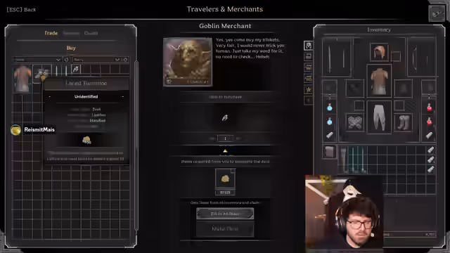 01:28:43Der Streamer beklagt, dass er nur eine Hauptwaffe hat, obwohl er eigentlich zwei braucht. Er hat einen blauen Zweihänder gefunden, ist sich aber unsicher, ob er ihn verwenden darf. Er erinnert sich daran, dass man beim Goldschmied jetzt zwei Attribut-Royce auf Ringe rollen kann, was er nutzt, um sich Ringe und ein Amulett zu craften. Beim Goblin-Merchant kauft er Gegenstände und ist enttäuscht von dem Ergebnis, da er nur schlechte Perks wie 'Resourcefulness' und 'Additional Magical Damage' bekommt. Er erwähnt, dass Yammy und Partychip gebannt wurden.