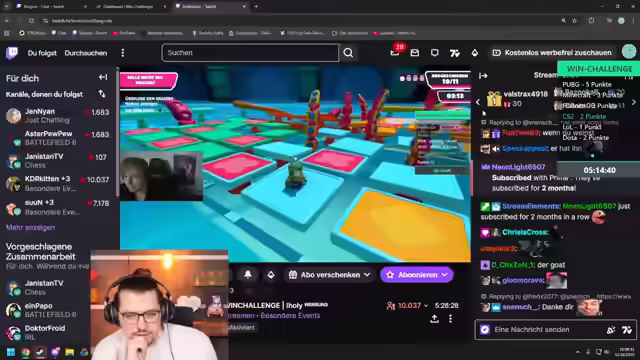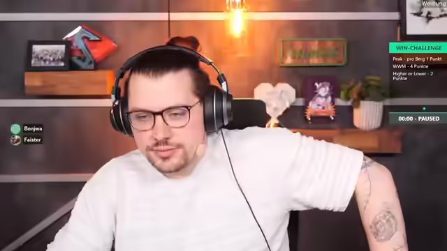 02:50:04Der Team-Captain Paul trifft verspätet ein und entschuldigt sich für die Verzögerung. Ihm werden die Regeln der Win-Challenge erklärt: Es handelt sich um einen Versus-Wettkampf bis 24 Uhr, bei dem das Team mit den meisten Punkten gewinnt. Jeder Win in einem Spiel gibt eine feste Punktzahl, die im Overlay angezeigt wird. Es besteht die Möglichkeit, Back-to-Back-Wins (oder Back-Free-Back für bestimmte Spiele) zu erzielen, um die Punkte zu verdoppeln. Bei Misserfolg gehen jedoch alle Punkte für diesen Versuch verloren. Die letzte Runde muss spätestens um 23:49 Uhr gestartet werden, darf aber durchgespielt werden. Paul äußert sich optimistisch bezüglich der Leistung seines Teams und der bevorstehenden Herausforderung.