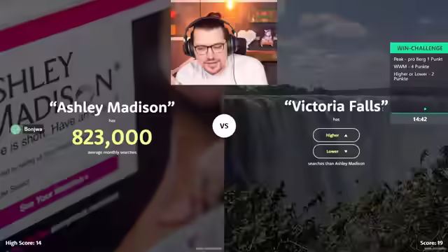 02:57:21Die Gruppe spielt "Higher or Lower" und stößt auf interessante Ergebnisse. Begriffe wie "Water Pollution" und "ST Loader" werden verglichen, wobei "ST Loader" überraschend mehr Suchanfragen hat. Auch "Budwar" (Budweiser) und "Lad Bible" sorgen für Diskussionen über die Popularität von Bier und Meme-News-Seiten. Eine besonders knifflige Frage betrifft "Sheldon Adelson" und "Thailand", wobei die Gruppe die Suchhäufigkeit von Personen im Vergleich zu Ländern einschätzt. Die Runde ist von vielen knappen Entscheidungen und Überraschungen geprägt, was die Dynamik des Spiels unterstreicht und die Teilnehmer immer wieder zum Nachdenken anregt. Trotz einiger Fehlentscheidungen gelingt es dem Team, eine respektable Punktzahl zu erreichen.