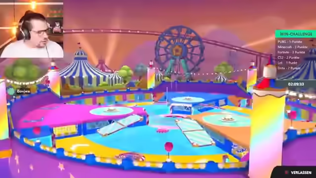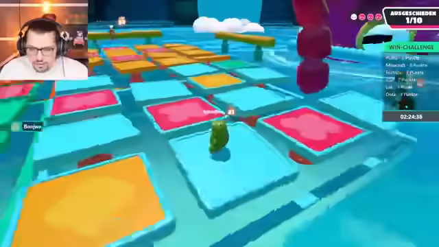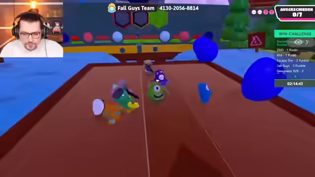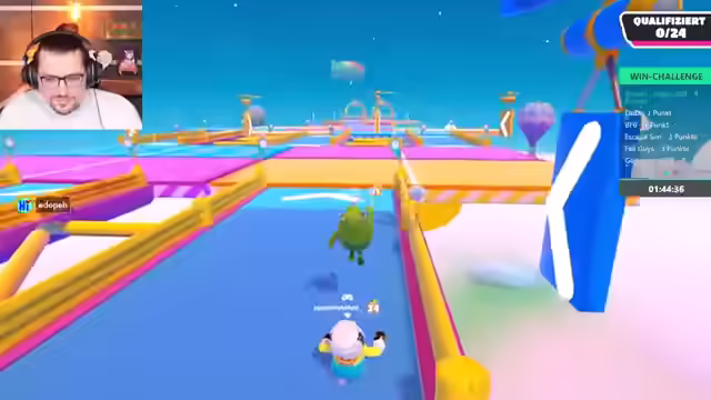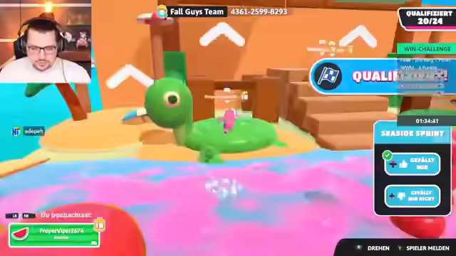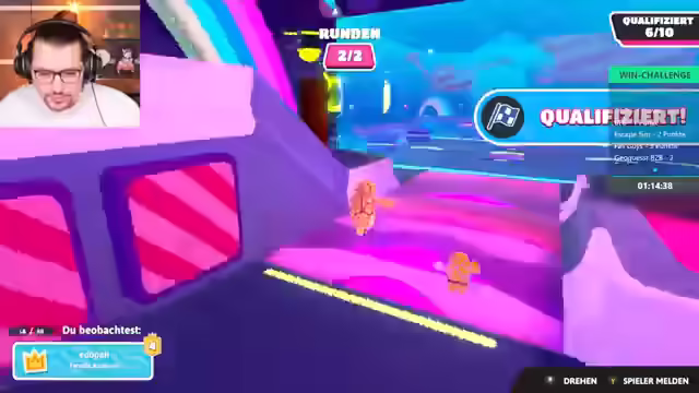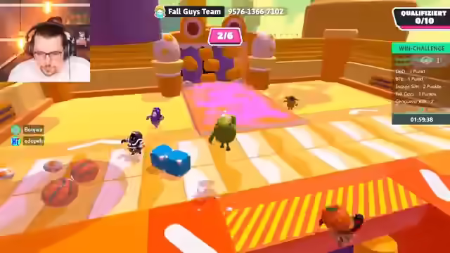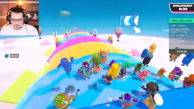 04:02:14Die Spieler starten eine Runde Fall Guys, wobei zunächst technische Probleme mit der Spieleinladung und der Lizenz behoben werden müssen. Nach erfolgreichem Beitritt wird die erste Runde im normalen Knockout-Modus gestartet. Die Spieler diskutieren ihre Gewinnchancen und ihre Fähigkeiten im Spiel, wobei einer der Spieler angibt, gut im Jump'n'Run zu sein, aber noch nie Fall Guys gespielt zu haben. Sie geben sich gegenseitig Tipps zur Steuerung und den Mechaniken des Spiels. Im ersten Level, einem Parcours mit Säulen und Türen, qualifizieren sich die Spieler erfolgreich für die nächste Runde. Es wird erwähnt, dass das Spielen ohne Sound eine Herausforderung darstellt, was jedoch als möglich erachtet wird, wenn man die Schritte der Gegner im Blick behält.
